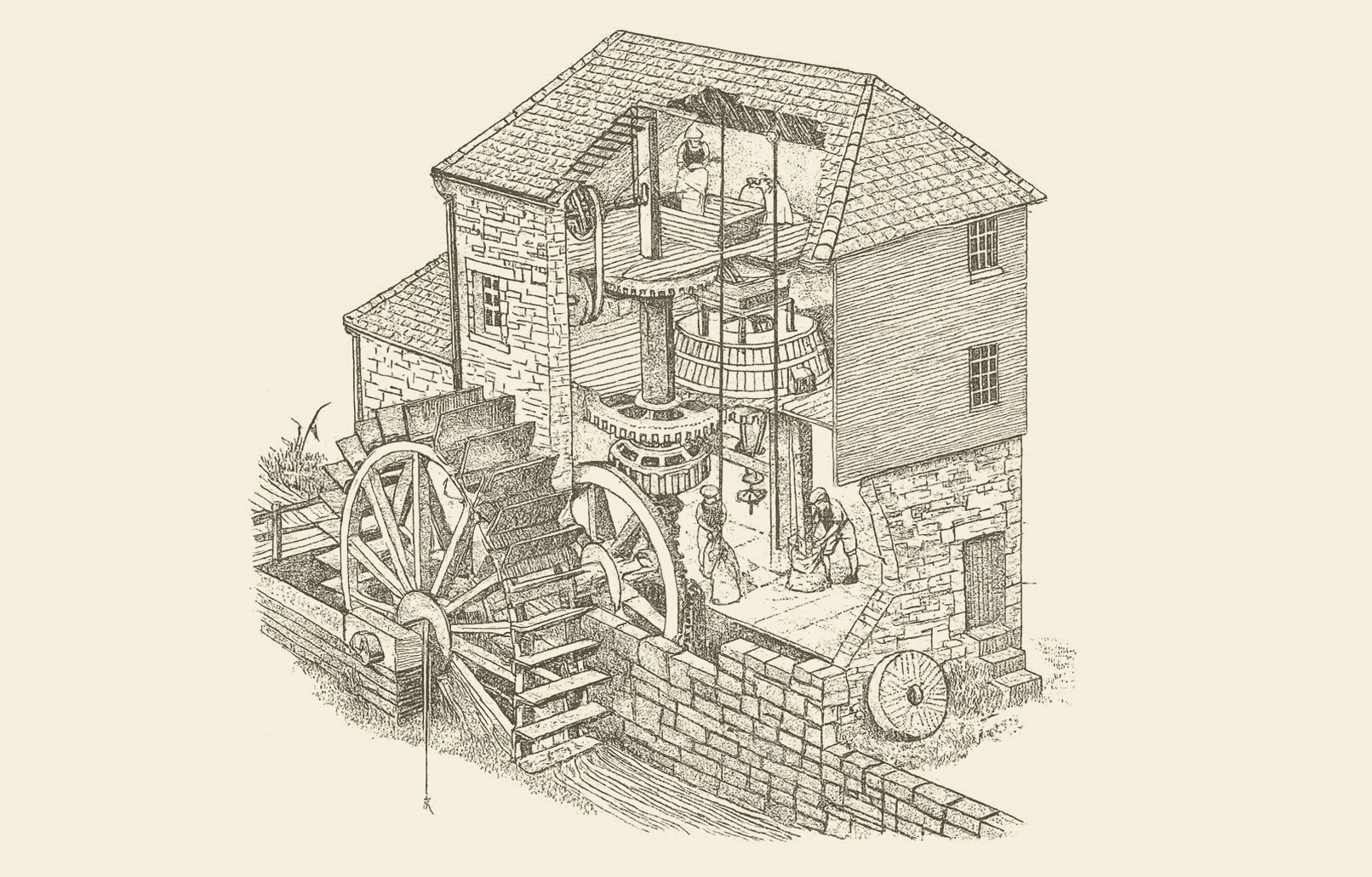 以水车为动力运转的磨坊。水力虽然强大,但供应不稳定,因此磨坊的选址和建造都受到季节的限