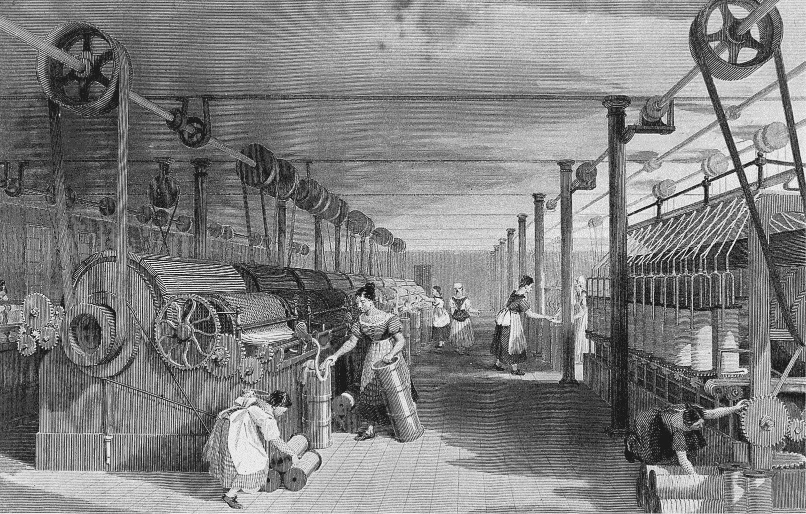 This 1835 engraving by Thomas Allom depicts a textile factory in Lancashhire, UK. It was